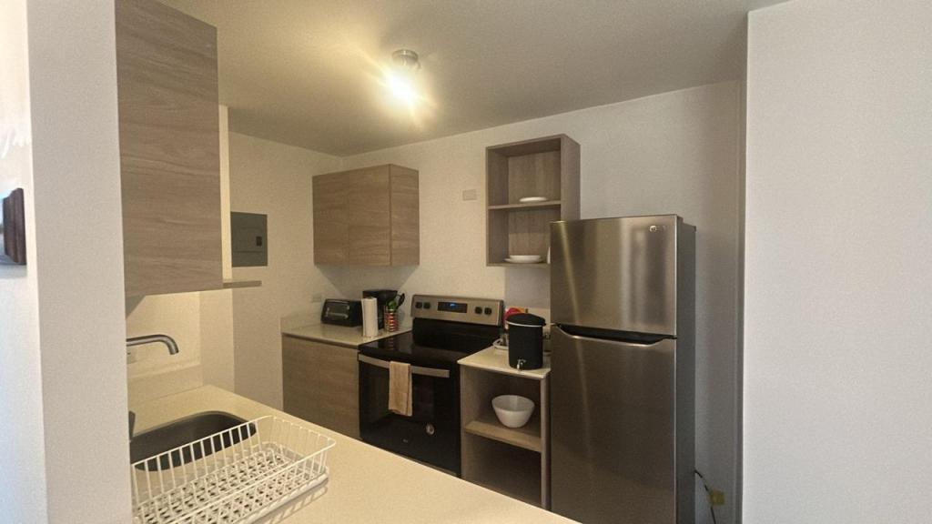 - Cocina moderna, totalmente equipada con línea blanca (nevera, estufa, microondas, lavadora)
