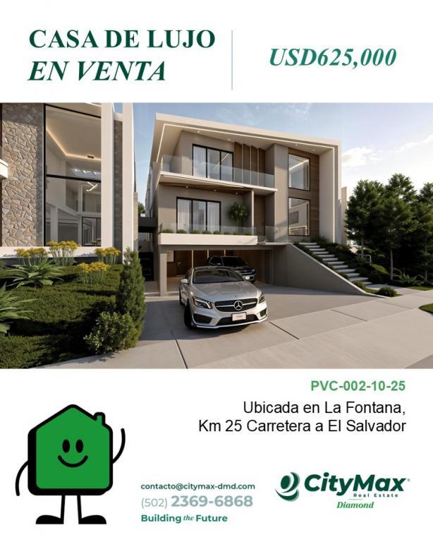 | Descripción: | CityMax Diamond (502) 2369-6868 PVC-002-10-25 USD625,000 Casa de Lujo en Venta en La Fontana Km 25 Carretera a El Salvador Ubicada en el exclusivo sector de Fraijanes, esta residencia redefine el concepto de vida moderna al combinar arquitectura contemporánea, naturaleza y privacidad en un entorno de alto nivel. Rodeado de jardines, bosque privado y amenidades premium, es el lugar ideal para quienes buscan confort, seguridad y plusvalía en Carretera a El Salvador. Amenidades Seguridad 24 horas Áreas verdes y senderos naturales Salón social Juegos infantiles Bosque privado con estanque y nacimiento de agua Propiedad cuenta con 651.17v² de Terreno y 507m² de Construcción distribuidos en 3 niveles 5 habitaciones 4.5 baños 2 salas Comedor Cocina Bodega y habitación de servicio 4 parqueos |
