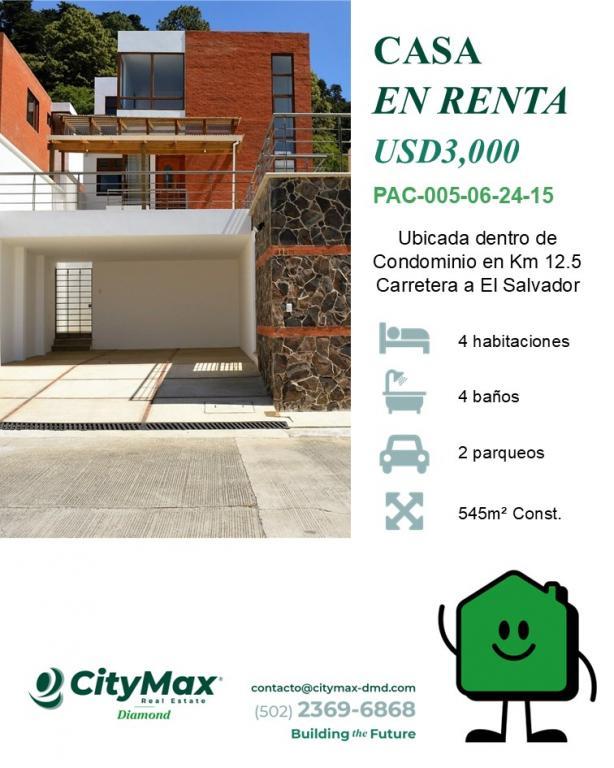 | Descripción: | CityMax Diamond (502) 2369-6868 PAC-005-06-24-15 USD3,000 Casa en Renta en Km 12.5 Carretera a El Salvador Ubicada dentro de condominio con seguridad 24 horas y doble garita de control en entorno seguro y exclusivo. Casa cuenta con 545m² de construcción distribuidos en: • Sala • Comedor • Cocina • Sala Familiar • 4 habitaciones • 4 baños • Jardín • Habitación de servicio • 2 parqueos Precio incluye Mantenimiento e IVA. |