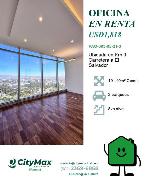 Amplia Oficina en renta, 191,40 m2. Ubicada en Km. 9 Carretera a El Salvador en Edificio Corporativo, Guatemala
